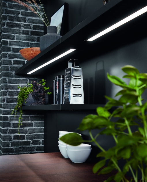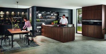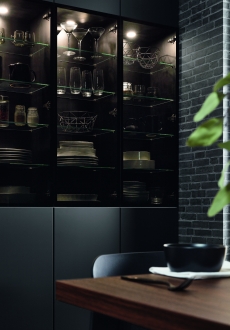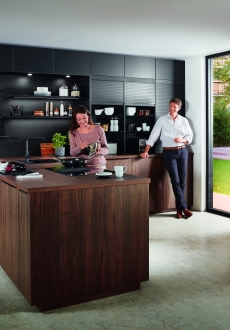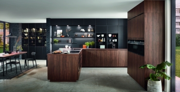 Díky osobitým materiálovým kontrastům vlašského ořechu a matné černé v minimalistickému designu působí tato kuchyně jako skutečný skvost. Černé osvětlené police v kombinaci se dřevem jsou tou pravou volbou pro všechny milovníky exkluzivního stylu. Vystavte si všechny vaše vzácné kousky nádobí do osvětlených vitrín a nápaditě schovejte vše ostatní do funkčních rolovacích jednotek.