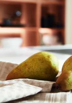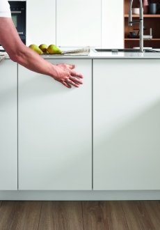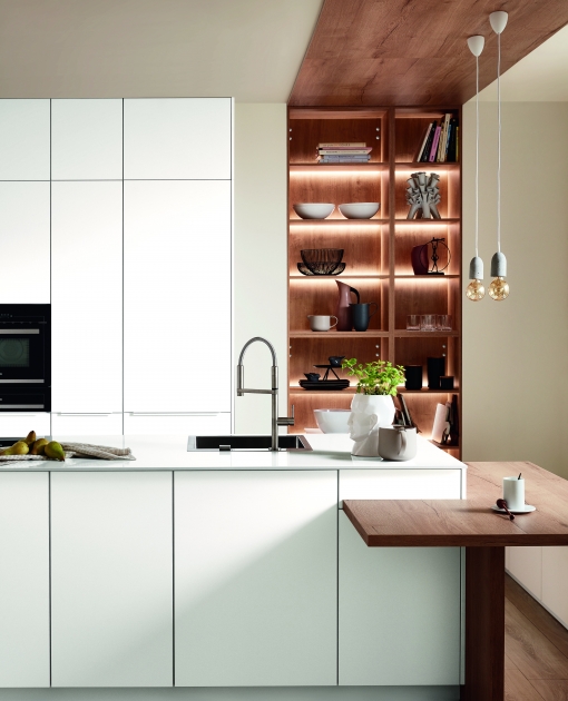 Vysoké skříně ke stropu v neutrálním bílém provedení opticky zvětšují celou místnost, a navíc poskytují široké spektrum úložného prostoru. Navzdory tomu kuchyň vypadá stále elegantně a spořádaně. Esteticky příjemné a velmi praktické provedení bez madel umožňuje otevřít skříňky jen lehkým zatlačením. Také zde nechybí ochranná povrchová úprava, díky které nikde nezůstávají otisky prstů, což je jistě v početné rodině nebo při vaření s přáteli velmi praktické.