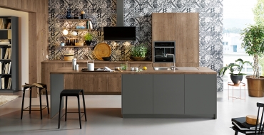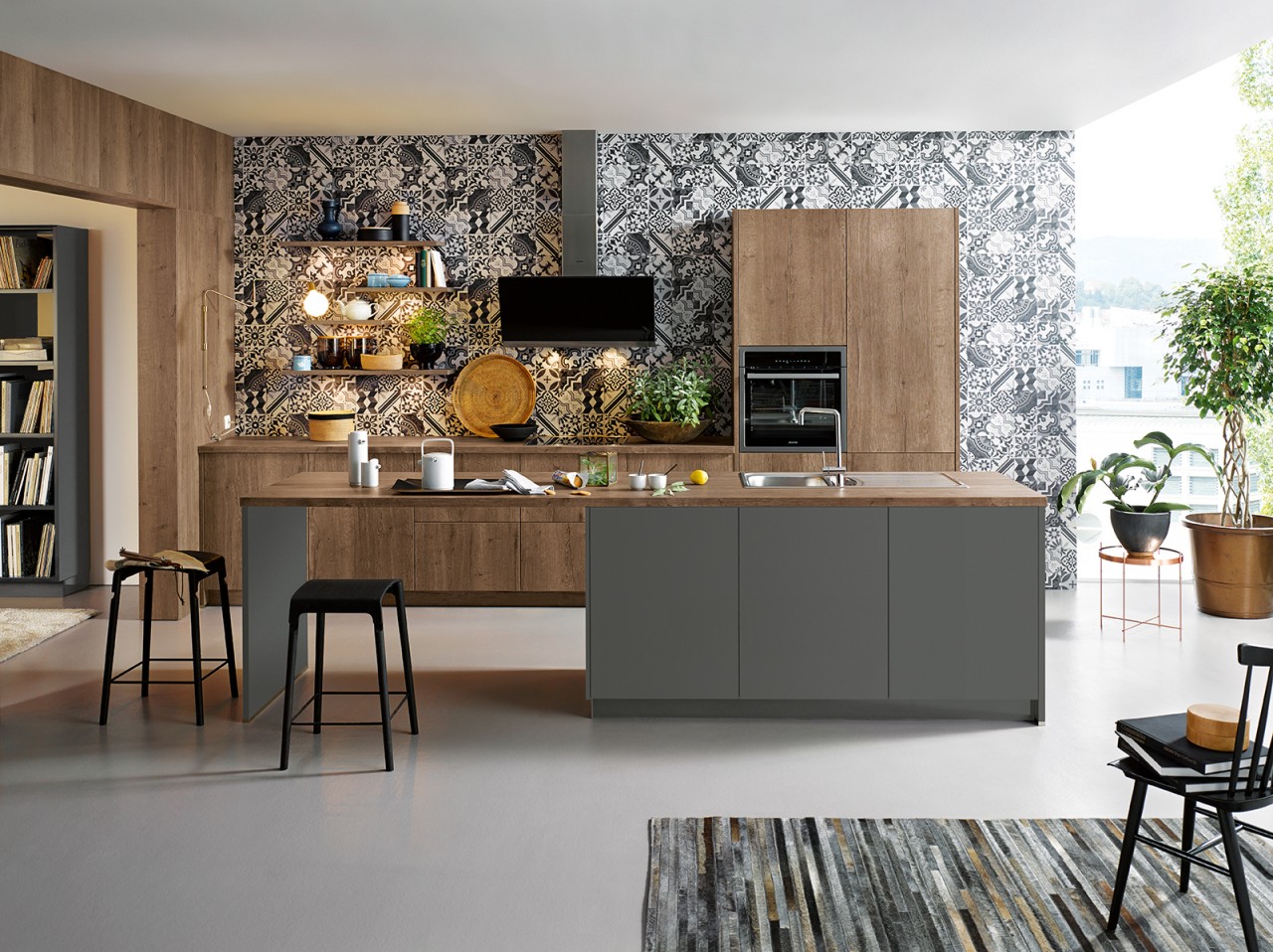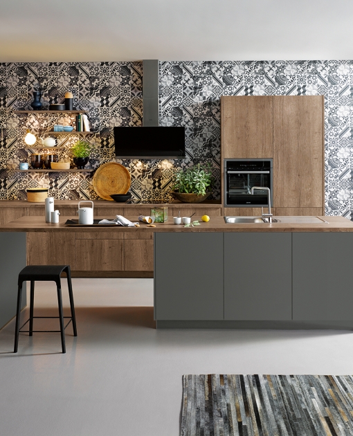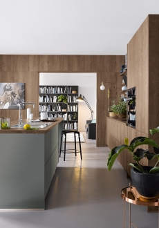 Zdařile kombinovaná imitace starého dubu synchropor a lakovaného šedého laminátu působí elegantním dojmem. Prostorná pracovní deska vám umožní připravovat hned několik pokrmů najednou a určitě vás potěší také prakticky integrované spodní led osvětlení. Za zmínku rozhodně stojí bezmadlové (bezúchytové) puristické provedení hlavní části, které posiluje celistvost a výdrž kuchyně společně se zasouvací a tlumící technikou šuplíků Motion. Celý koncept uspořádání kuchyně pak ideálně doplňuje obytný prostor s impozantní knihovnou.