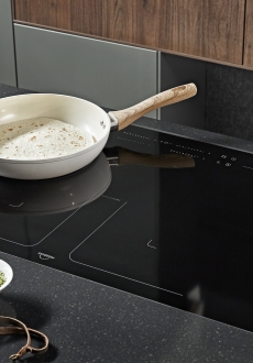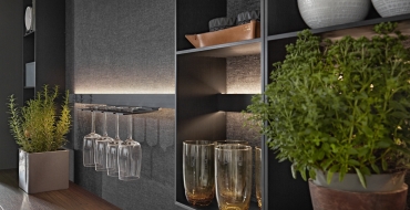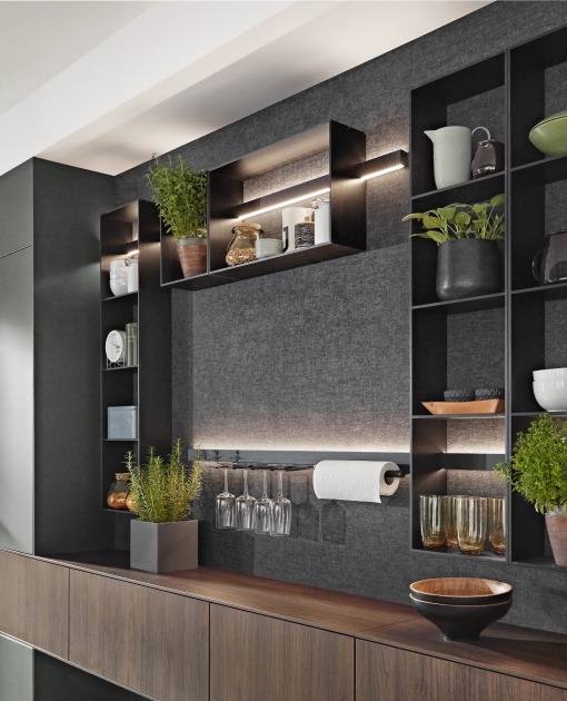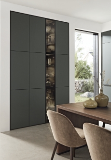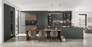 Nadčasová kombinace ultramatné zelené a dřevěného povrchu ořech si vás získá na první pohled. Dominantu celé kuchyně představuje prostorný kuchyňský ostrůvek, který je důmyslně propojen s jídelním stolem. Dostatek úložného prostoru poskytuje nespočet nástěnných skříněk, které díky bezmadlovému provedení působí velmi minimalisticky. Nemusíte se ale bát nevzhledných otisků prstů – veškeré povrchy jsou obohaceny o matný povrch proti jejich zanechávání. Estetickým prvkem obohajující úložnou stěnu jsou skříňky Flat s černým sklem s integrovaným LED podsvícením pro vaše nejcennější kousky nádobí. LED podsvícení najdeme taktéž u polic Sign Emotion umístěných příhodně nad pracovní linkou. Díky nim budete mít po ruce vždy to nejnutnější.