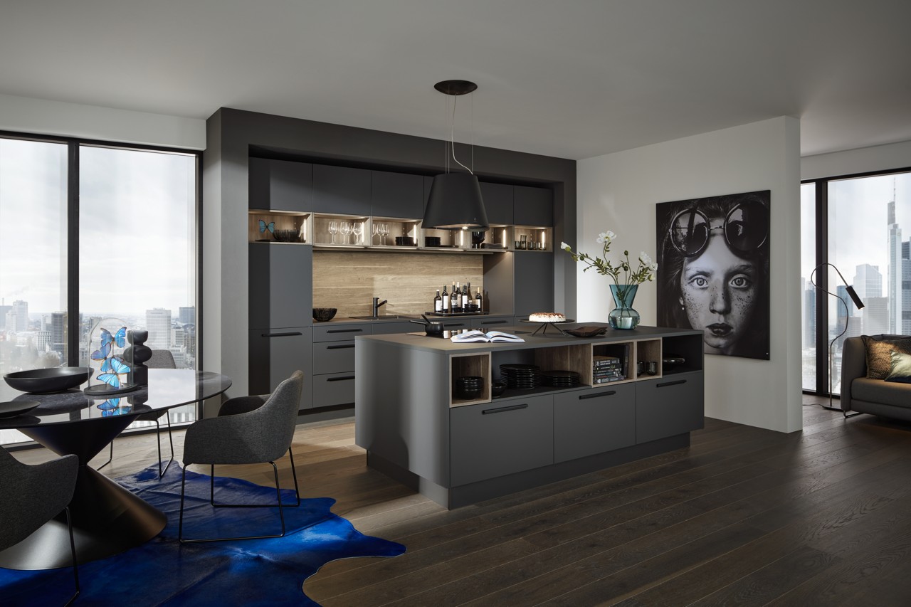 Kuchyně s jednoduchou atmosférou ukazuje propojení trendů s dlouhodobě oblíbenými odstíny. Povrchy v úpravě proti otiskům prstů reflektují důraz na tlumené tóny. Jednotlivé segmenty jako čela nábytku nebo madla lze vybírat z několika řad a navzájem vhodně kombinovat.