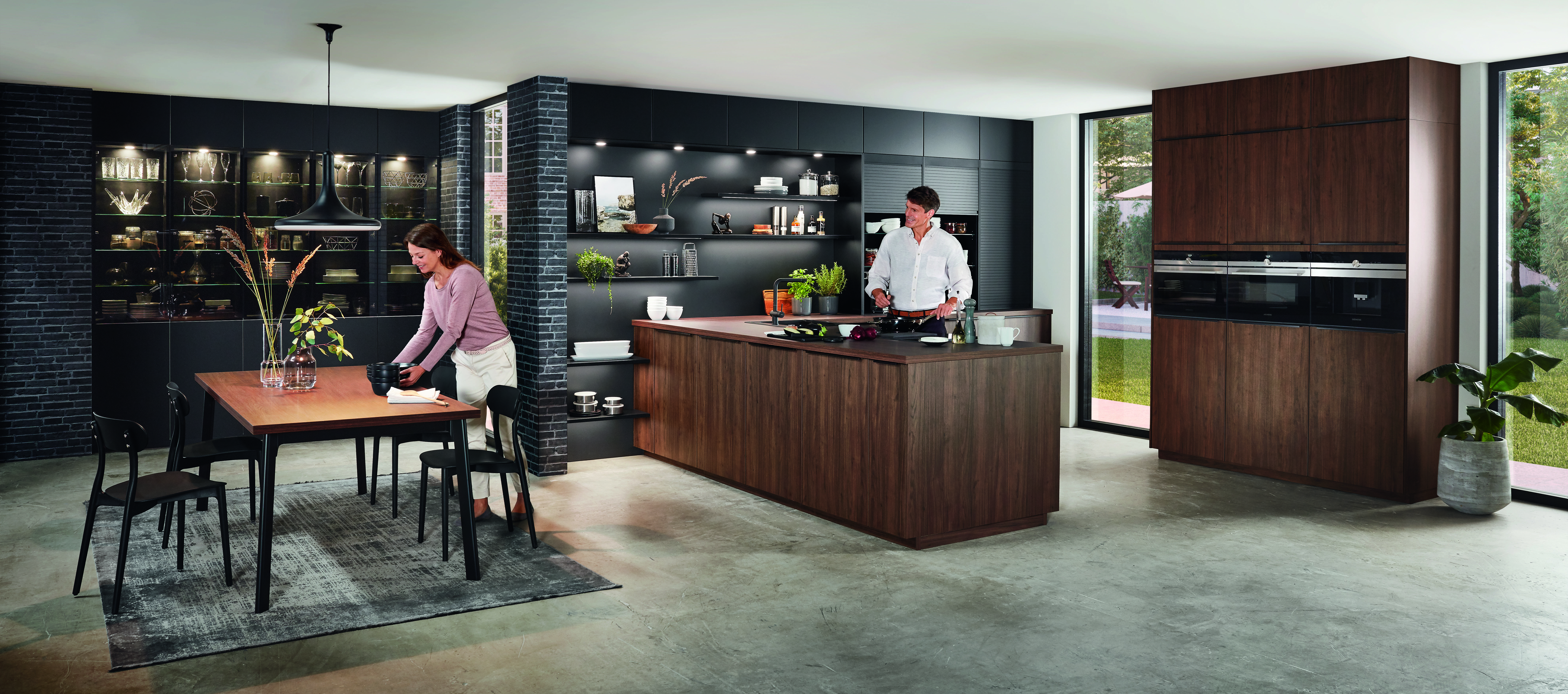 Nadčasový design této kuchyně spojuje matné povrchy a dřevěné skříně v provedení vlašský ořech s puncem přirozenosti. Matné provedení disponuje speciálním povlakem proti otiskům prstů. Vysoká nástěnná jednotka s černým sklem nabízí mnoho variant realizace úložného prostoru.