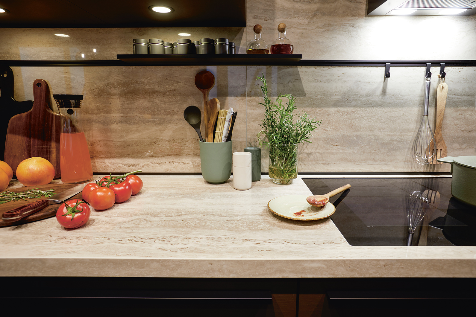 Kuchyně určená pro spojení vaření, bydlení a práce. Policové skříně v dřevěném vzhledu a kuchyňský pult oddělují jednotlivé zóny. Vysoko zabudovaná myčka se otevírá stejně snadno a bez úchytů jako chladnička. Všechny výsuvy jsou vybaveny elektrickým systémem podpory otevírání.